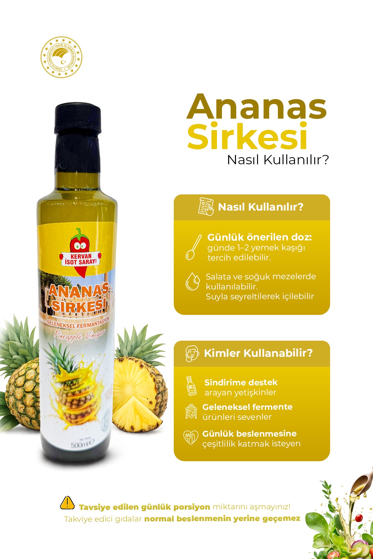 Diğer sirkelere göre daha aromatik bir tada sahip olan ananas sirkesi, son zamanlarda sağlık için de sıkça tercih edilir. İçeriğinde C vitamini, B vitaminleri, potasyum, magnezyum ve antioksidanlar bulunur. Bu nedenle bağışıklığı destekleyici, sindirimi kolaylaştırıcı ve metabolizmayı düzenleyicietkileriyle öne çıkar